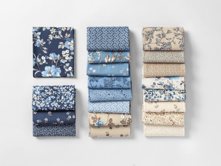These beautiful fabrics are a celebration of flourishing gardens and feminine detailing from detailed florals to organic scrolls to geometric dots- all in a palette of soft blue, navy, taupe, and cream colors.