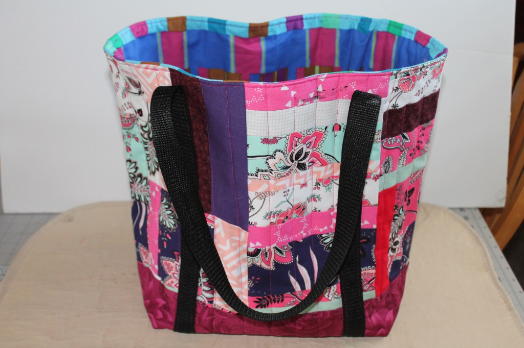 item: 286 Size: 15 inches tall by 18 inches wide. Has strong black straps on both sides to hold your groceries. This beautiful combination of pink and dark purple colors is a real eye catcher!