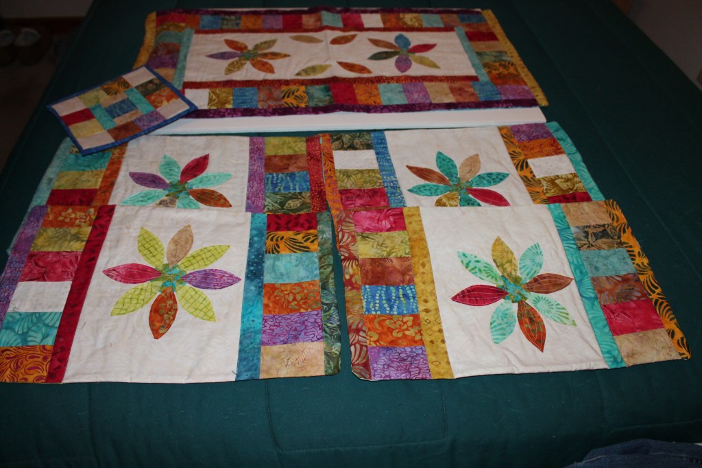 Your table will look fantastic with these Batik fabric colors. Each Placement and Table Runner has applique flowers sewing on by hand. This is sold as a set. The hot pad has insulated material to protect your table. These items can be handwashed and hung to dry. This material is all Batik fabric.