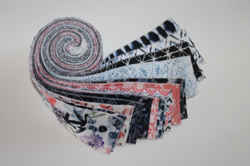 This jelly roll contains 2.5″, 40 pieces of 2.5″ x 44″ stripes of fabric. 100 cotton, some prints are duplicated. Price includes shipping!